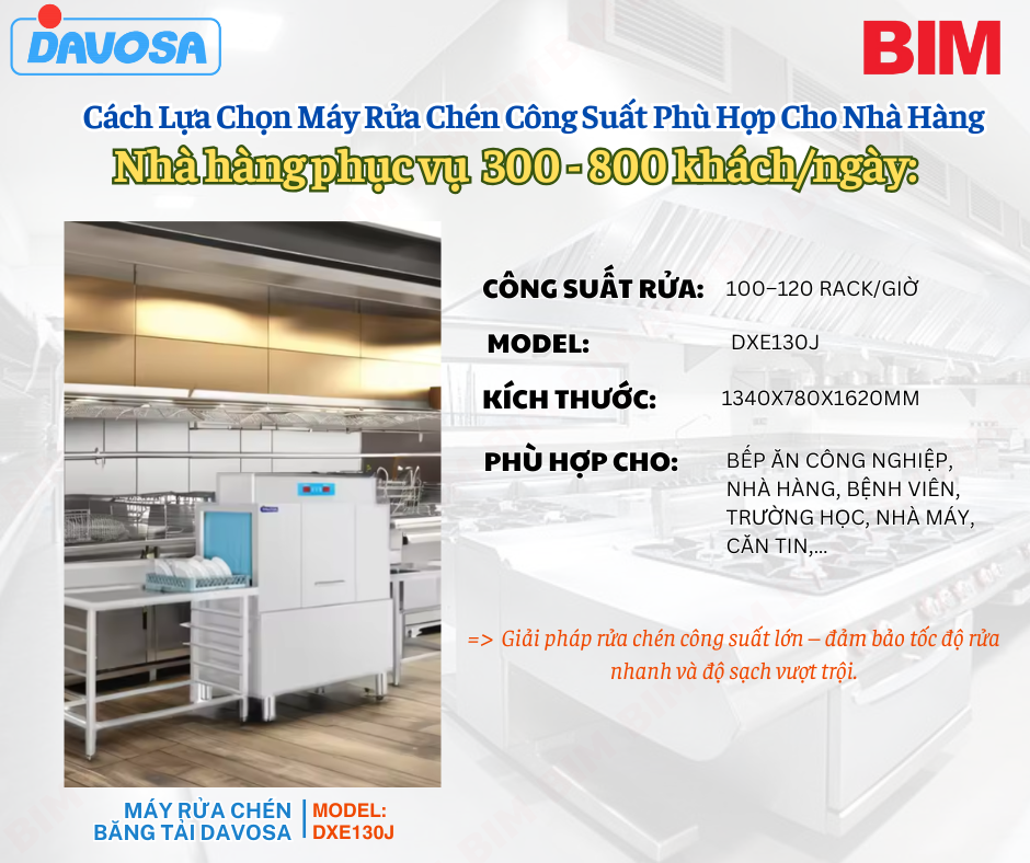 Nhà hàng 300–800 khách (bếp rộng, cần rửa khối lượng lớn liên tục):