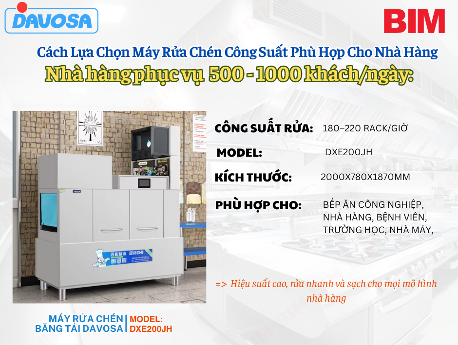 → Máy rửa chén băng tải DXE200JH – công suất 180–220 rack/giờ, phù hợp mô hình phục vụ quy mô lớn, nhà hàng Buffet, nhà hàng tiệc cưới, suất ăn công nghiệp